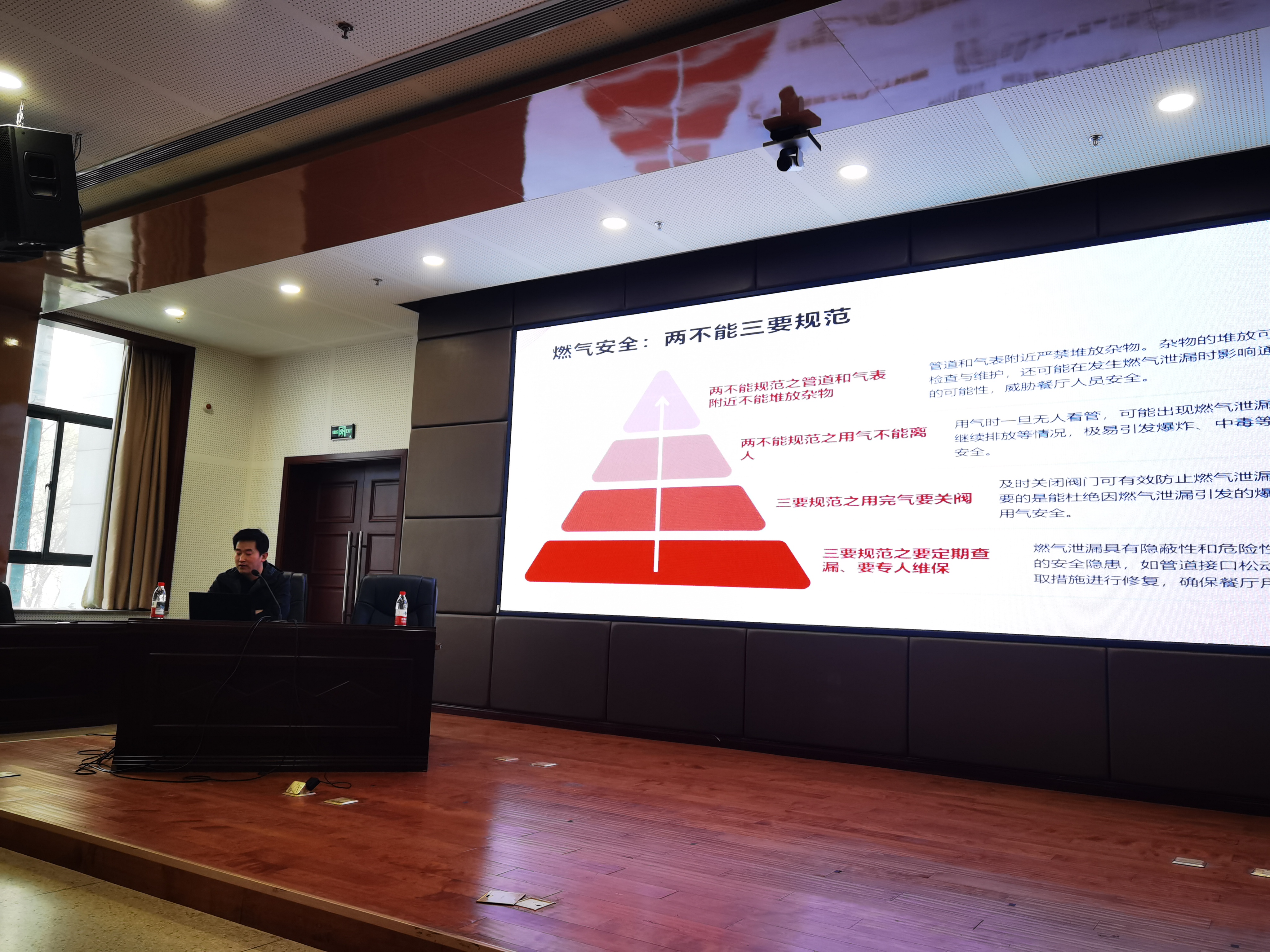 接着,朱主任从加强厨房安全生产培训的必要性、消防安全、用电安全、燃气安全、机械安全、行为规范安全等方面进行了详细培训解读,培训覆盖了餐厅各类安全规范要求及安全操作规程,结合日常检查实际案例并紧密联系高校火灾案例,整个培训内容丰富、图文并茂、案例详实、感受真切。